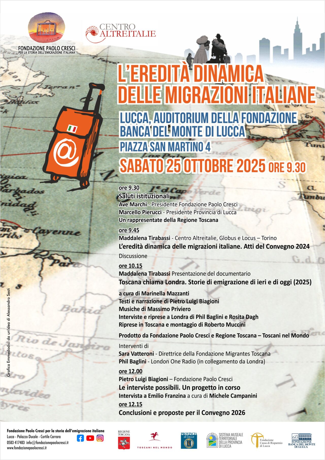 Presentazione degli 𝐀𝐭𝐭𝐢 𝐝𝐞𝐥 𝐜𝐨𝐧𝐯𝐞𝐠𝐧𝐨 𝐝𝐞𝐥 𝟐𝟎𝟐𝟒 e 𝐝𝐞𝐥 𝐝𝐨𝐜𝐮𝐦𝐞𝐧𝐭𝐚𝐫𝐢𝐨 𝐓𝐨𝐬𝐜𝐚𝐧𝐚 𝐜𝐡𝐢𝐚𝐦𝐚 𝐋𝐨𝐧𝐝𝐫𝐚. 𝐒𝐭𝐨𝐫𝐢𝐞 𝐝𝐢 𝐞𝐦𝐢𝐠𝐫𝐚𝐳𝐢𝐨𝐧𝐞 𝐝𝐢 𝐢𝐞𝐫𝐢 𝐞 𝐝𝐢 𝐨𝐠𝐠𝐢 prodotto dalla “Fondazione Paolo Cresci per la storia dell’emigrazione italiana” (2025)nell’ambito di un progetto cofinanziato dalla Regione Toscana – Toscani nel Mondo 📌Lucca, Auditorium della Fondazione Banca del Monte di Lucca, Piazza San Martino […]